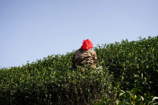 A worker picks up Anji white tea in Anji county, Zhejiang province, March 25, 2021. [Photo/IC]
