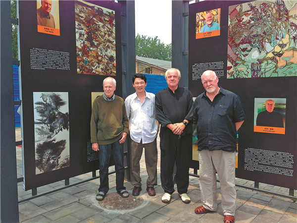 Ren Ming (second from left) with three artist friends, Fred Martin (left) and Jeremy Morgan (second from right) from the San Francisco Art Institute, and David Frazer (right) of the Rhode Island School of Design, at their joint exhibition at the Beijing 798 Art Zone in 2014. [Photo provided to China Daily]